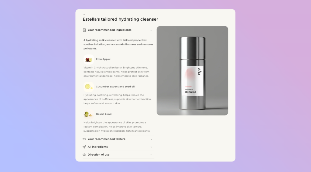 Each quiz respondent was matched to a four-step Skinwise regimen—cleanser, serum, moisturiser, and SPF—using Inference Beauty’s proprietary product database and ingredient matching engine. Inference Beauty’s scalable and adaptive platform was customised to reflect Skinwise’s product philosophy, brand identity, and user flow