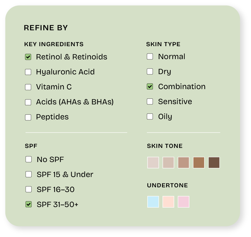 In beauty e-commerce, effective product filters include options like skin type, concern (anti-aging, acne, hydration), ingredient preferences (fragrance-free, vegan), and shade range — helping customers navigate large product catalogs to find their ideal match.